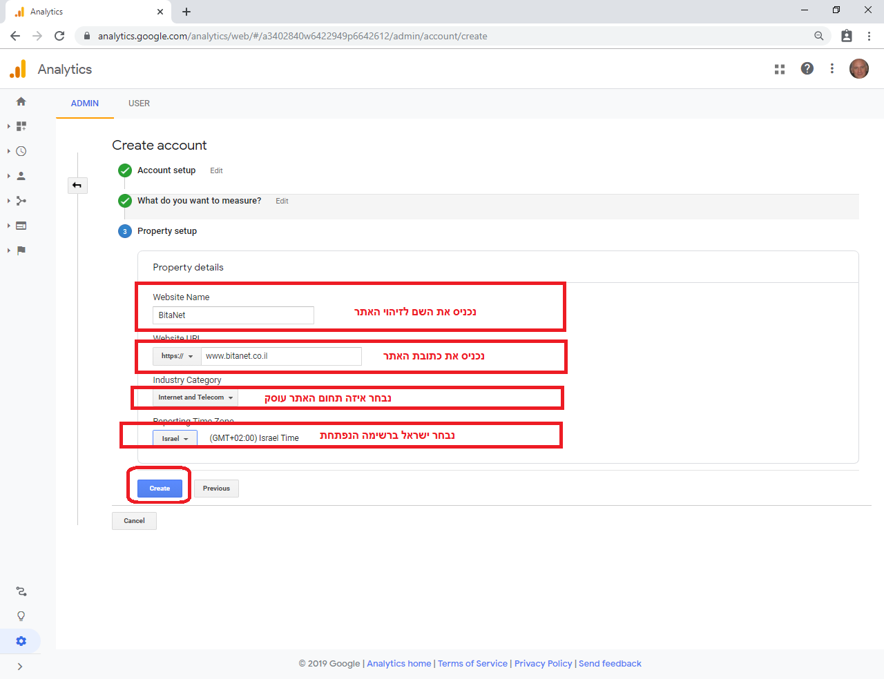 מכניסים את שם האתר. את כתובת האתר. בוחרים קטגוריה של תעשייה. ובוחרים באזור הזמן ישראל.