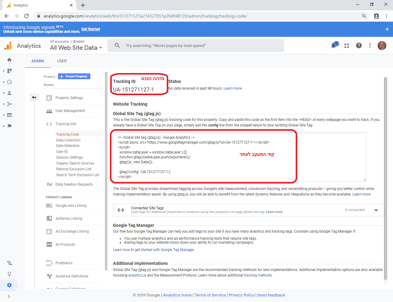 נקבל את המסך הבא שמראה לנו שהוקם הנכס וקיבלנו את קוד המעקב, המזהה של הנכס שהקמנו מופיע בראש הדף ונראה דומה לזה- Tracking ID UA-151271127-1 המספרים יהיו שונים לכול נכס שתקימו: